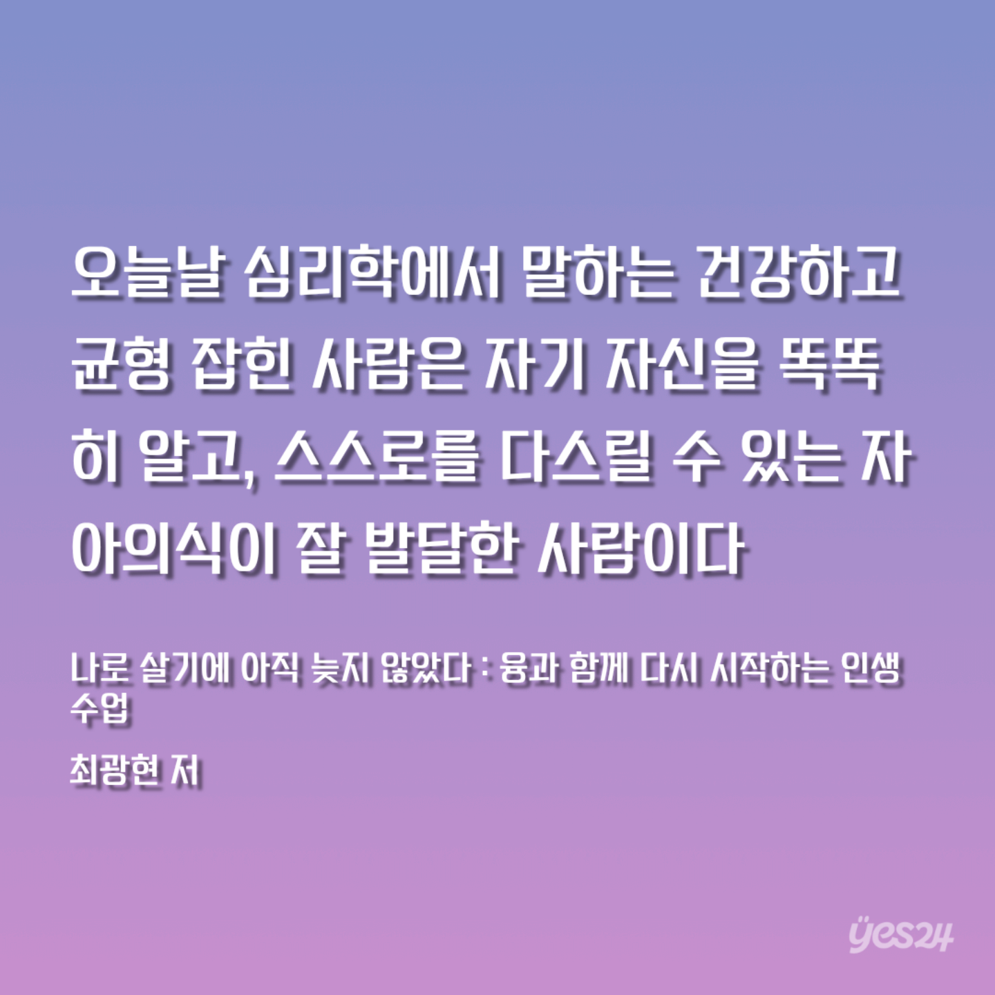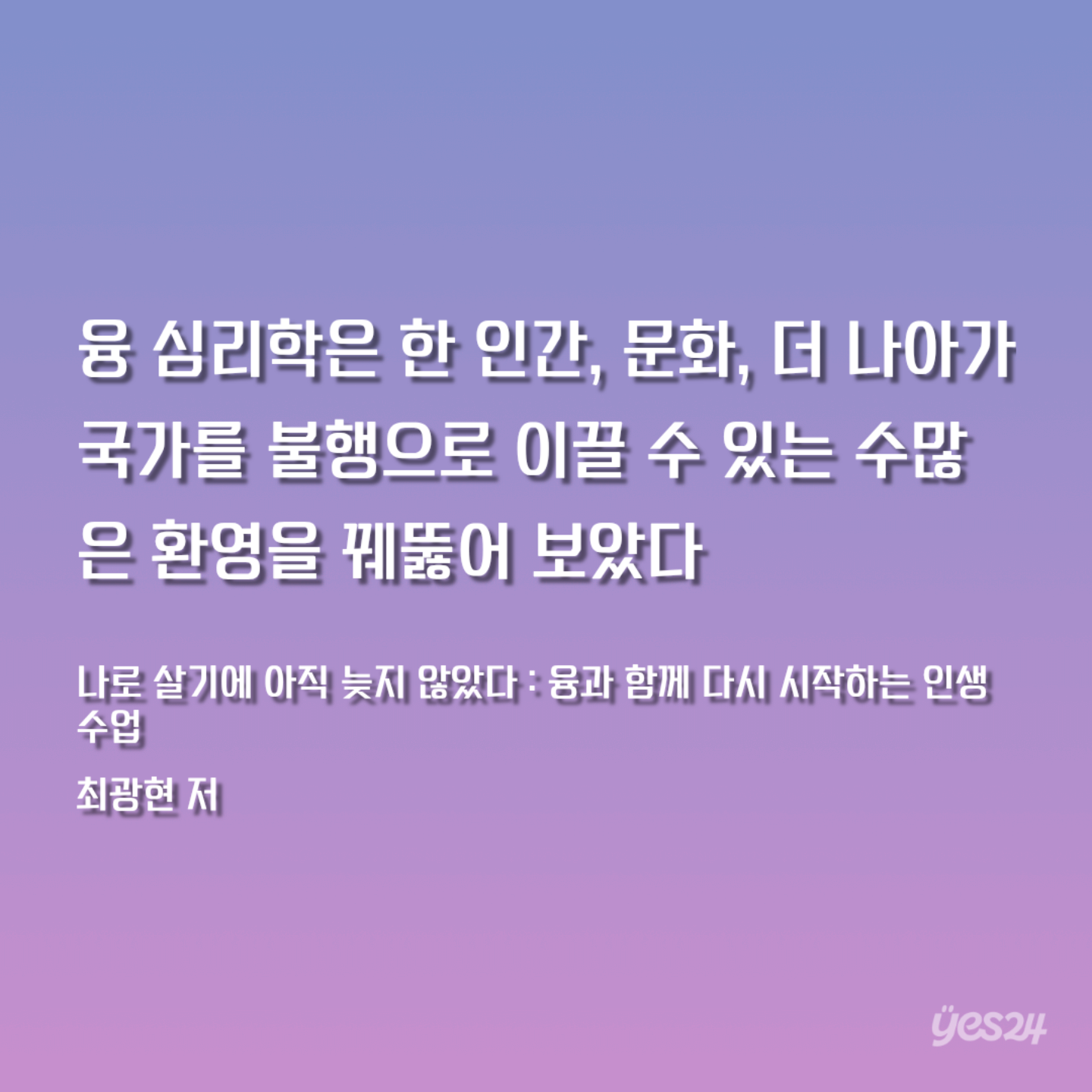 최광현 작가의 나로 살기에 아직 늦지 않았다는 바로 그 질문에서 시작하는 책입니다. 심리학자 칼 구스타프 융의 이론을 바탕으로 인생을 어떻게 다시 시작할 수 있는지를 이야기합니다.