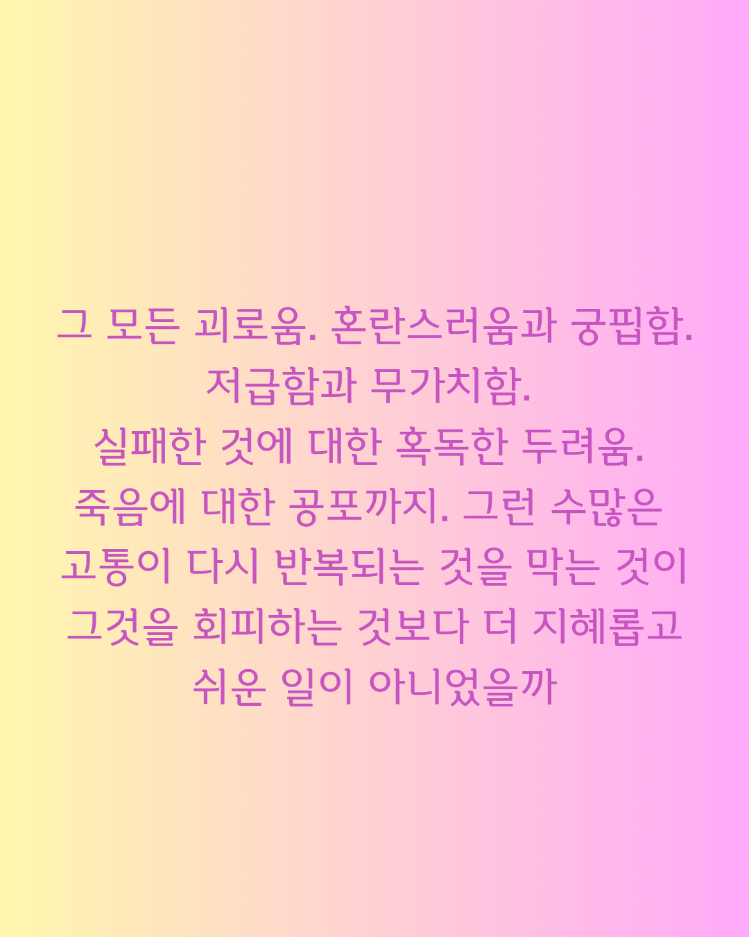 그 모든 괴로움. 혼란스러움과 궁핍함. 저급함과 무가치함. 실패한 것에 대한 혹독한 두려움. 죽음에 대한 공포까지. 그런 수많은 고통이 다시 반복되는 것을 막는 것이 그것을 회피하는 것보다 더 지혜롭고 쉬운 일이 아니었을까