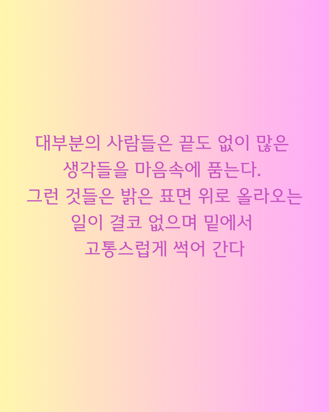말하지 못하고 속으로만 삭이는 생각들이 있습니다. 꺼내지 못한 감정들이 안에서 썩어가고 있다는 표현이 불편하지만 정확했습니다. 글을 쓰거나 누군가에게 털어놓는 것이 왜 중요한지 이 문장이 말해줍니다