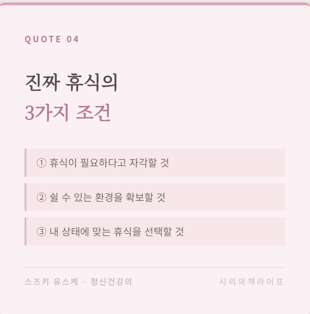 가장 중요한 것은 첫 번째입니다. 내가 지금 쉬어야 한다는 것을 아는 것. 그런데 이것이 생각보다 훨씬 어렵습니다. 그 이유가 이 책의 핵심입니다