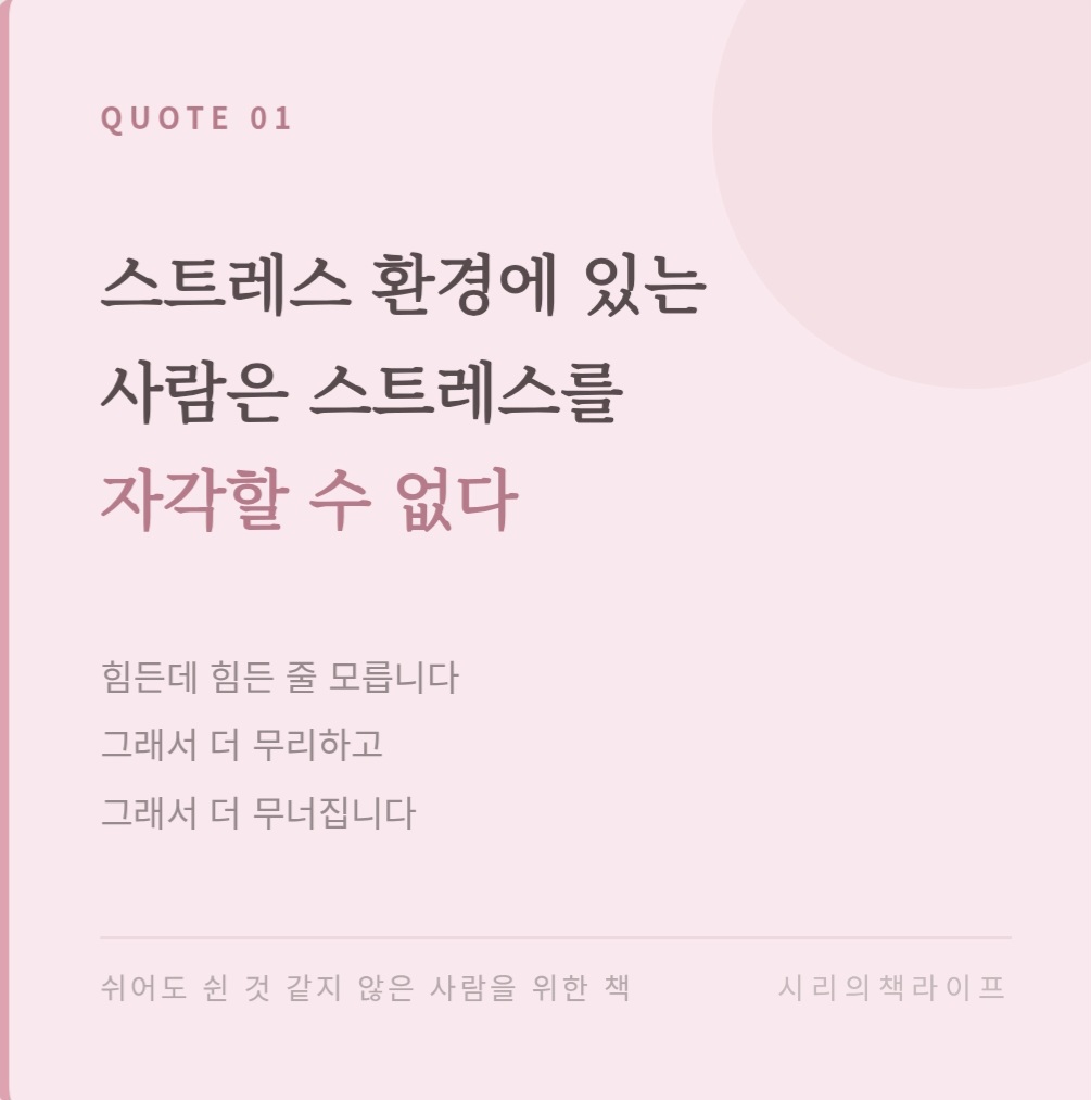 항상 피곤한 분. 쉬어도 쉰 것 같지 않은 분. 휴가를 내도 마음이 진정되지 않는 분. 번아웃이 왔는데 왜 그런지 모르는 분께 추천합니다. 의학적 근거를 바탕으로 쓰인 책이라 신뢰가 가고 우리 일상과 연결된 이야기라 술술 읽힙니다. 이 책을 읽고 나면 왜 내가 이렇게 피곤했는지 비로소 이해하게 됩니다