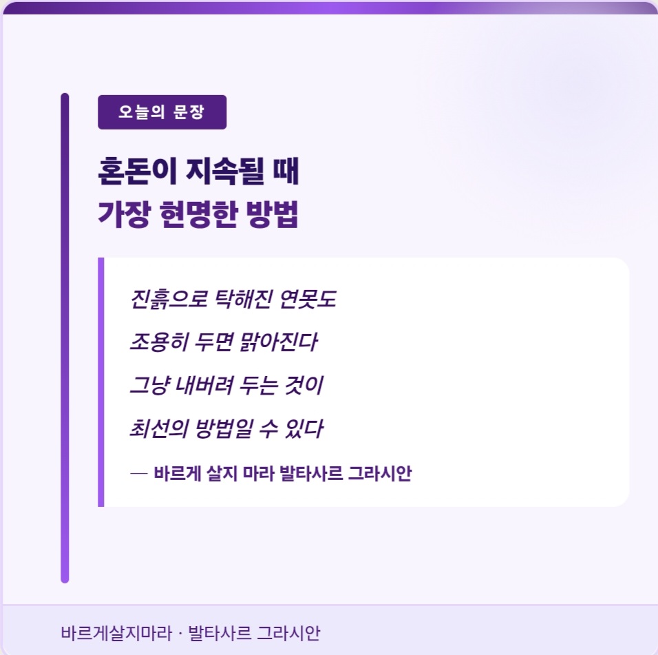 모든 문제를 당장 해결하려고 달려들지 않아도 된다는 말입니다. 가만히 두면 맑아지는 것들이 있습니다. 개입할수록 더 흐려지는 것들도 있습니다. 이 문장 하나가 지금 내 삶의 어떤 상황에 그대로 적용됐습니다.