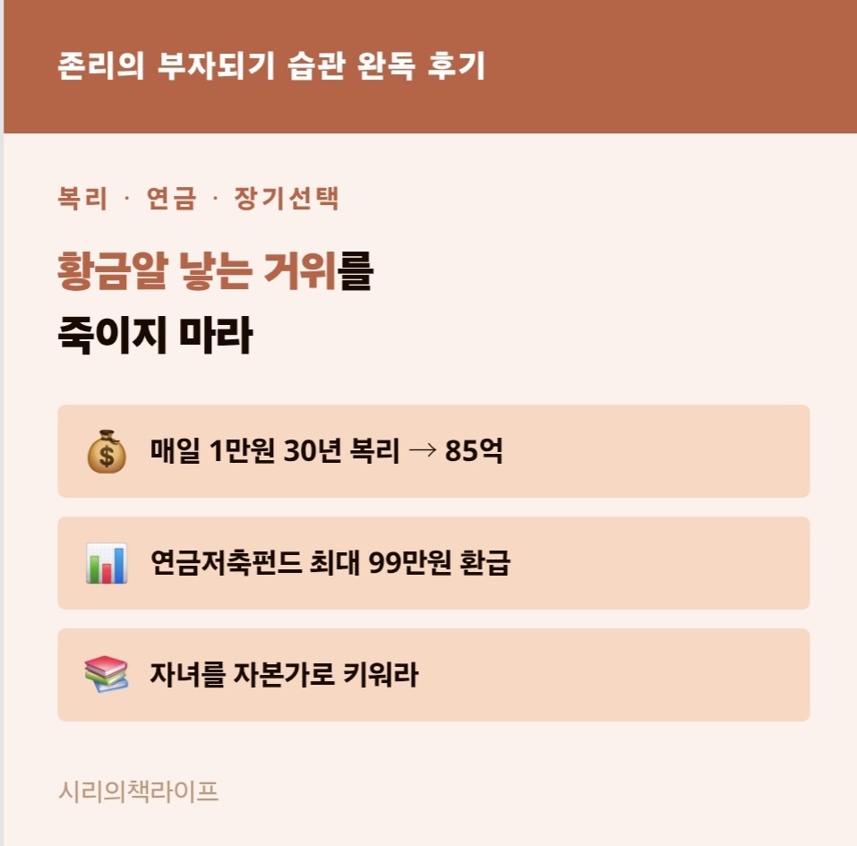 존리의 부자되기 습관은 출간 이후 30만부 이상 팔린 베스트셀러다. 투자 기법을 가르치는 책이 아니다. 돈을 대하는 태도와 라이프스타일 전체를 바꾸는 것을 목표로 한다.