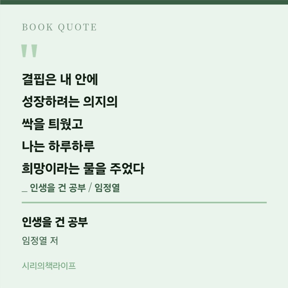 힘겨운 날들을 버텨왔지만 그 시간들이 오직 어둠뿐이었던 것은 아니다. 결핍은 내 안에 성장하려는 의지의 싹을 틔웠고 나는 하루하루 희망이라는 물을 주며 그 싹을 조용히 키워왔다.
