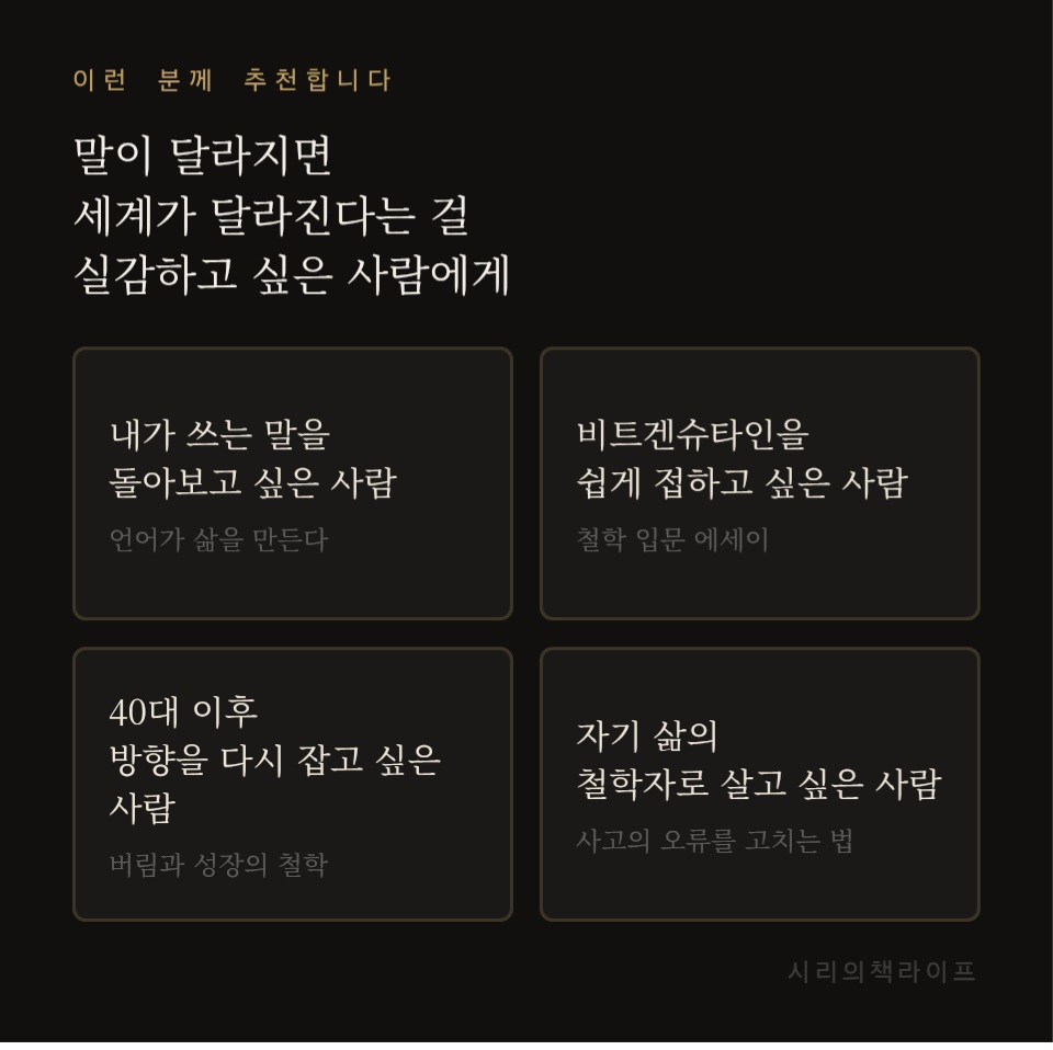 내가 쓰는 말을 돌아보고 싶은 사람 비트겐슈타인 철학을 쉽게 접하고 싶은 사람 40대 이후 삶의 방향을 다시 잡고 싶은 사람 그리고 자기 삶의 철학자로 살고 싶은 사람에게 맞는 책이다.