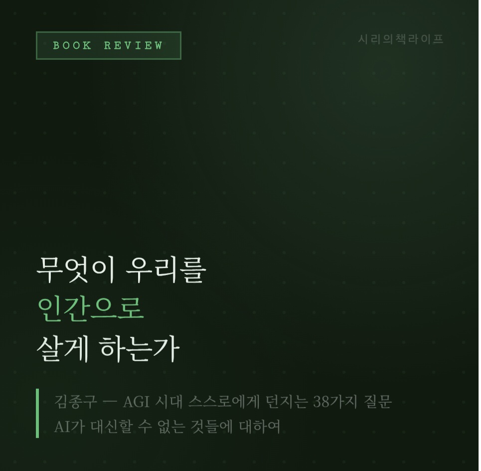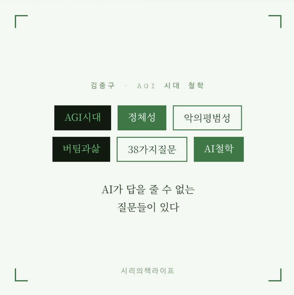 AI가 글을 쓰고 그림을 그리고 판단을 대신하는 시대가 됐다. 이 흐름 속에서 우리는 무엇을 잃고 있는가. 무엇을 붙잡아야 하는가. 김종구 저자의 무엇이 우리를 인간으로 살게 하는가는 그 질문을 정면으로 다루는 책이다. AGI 시대 스스로에게 던져야 할 38가지 질문을 담았다.