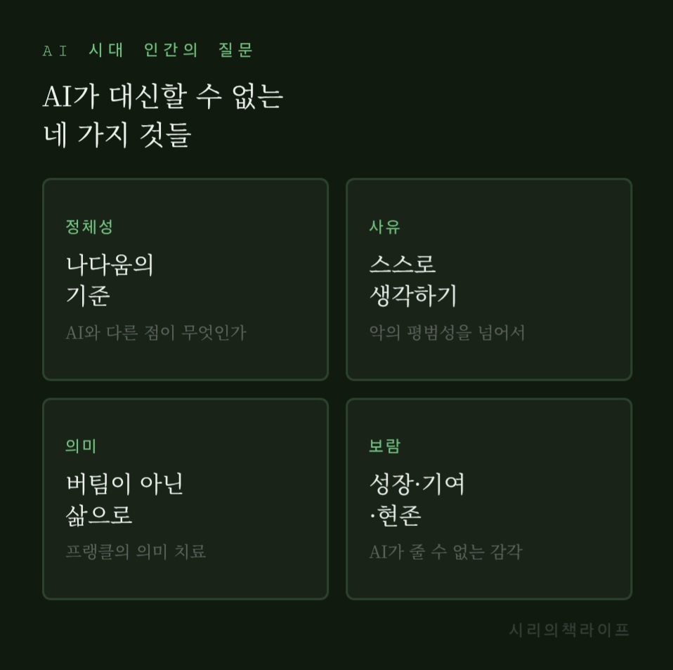 보람의 세 가지 원천이 세 번째 주제다. 성장·기여·현존이 그것이다. AI가 더 뛰어난 결과물을 만들어도 내가 직접 노력하고 실패하고 다시 시도하는 과정에서 오는 보람은 AI가 대신할 수 없다고 강조한다.