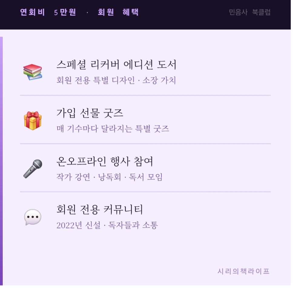 책을 꾸준히 읽고 싶은데 동기부여가 필요한 사람 민음사 도서를 좋아하는 사람 작가 강연이나 독서 모임에 참여해보고 싶은 사람 그리고 소장 가치 있는 스페셜 에디션 도서에 관심 있는 사람에게 잘 맞는 멤버십이다.
